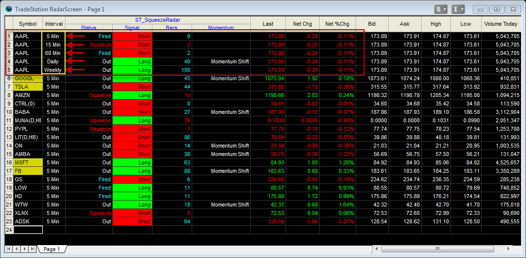 Each of the columns is related to the Squeeze indicator. The ST SqueezeRadar allows you to quickly scan your watchlist for setups based on your trading plan.
