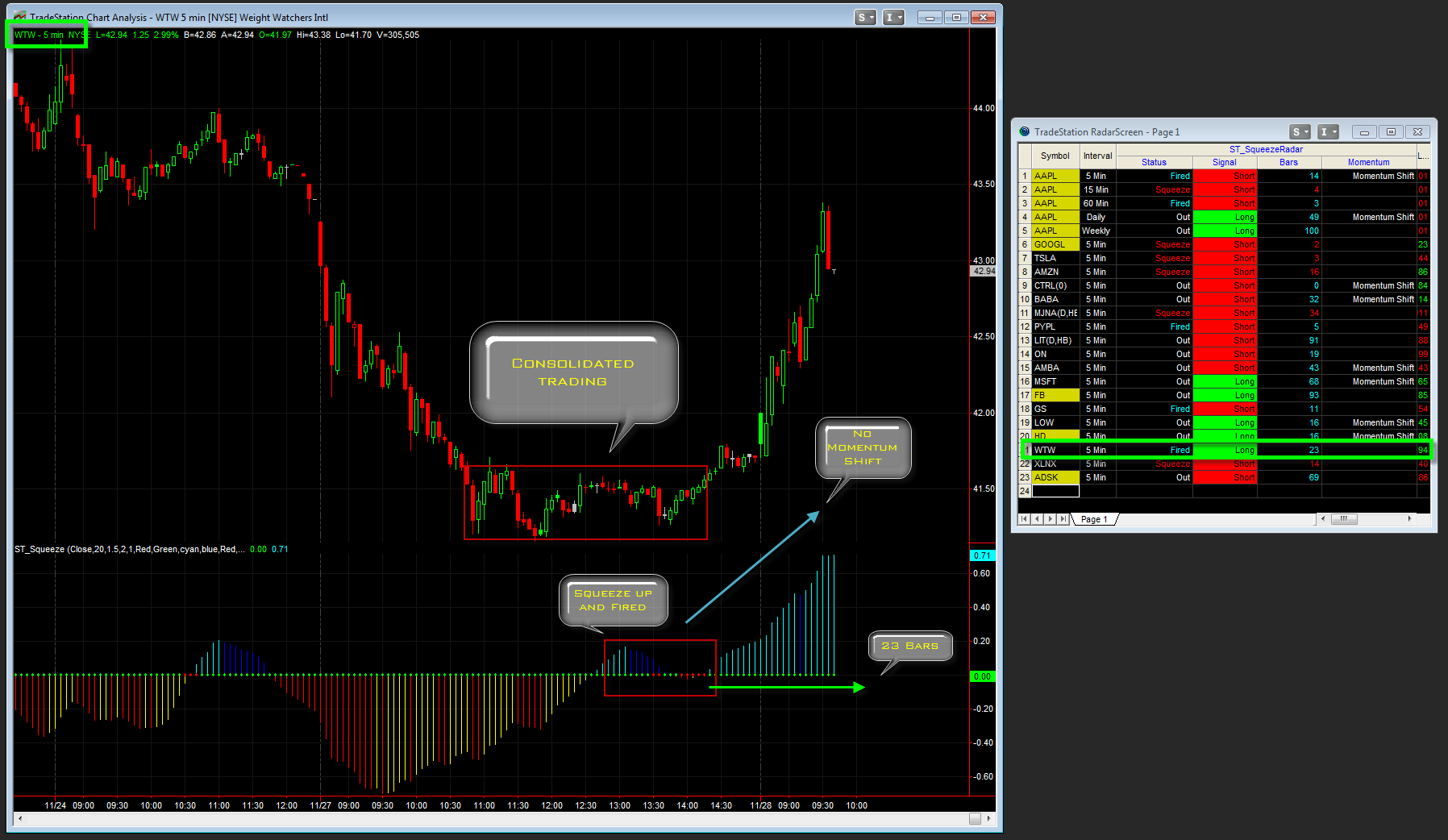 Notice for WTW, it has a Squeeze on the 5 Minute chart which has fired 21 bars ago. It also lets you know its is a continuation of bullish momentum.. See the corresponding chart below for a better look at this compared to the actual Squeeze displayed with the chart.